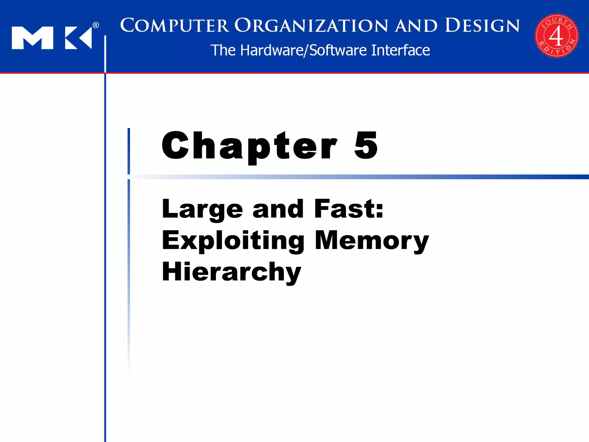 The document discusses memory hierarchy and caching techniques used to improve memory access performance. It explains that caches exploit locality by copying frequently accessed data from slower memory to faster caches closer to the CPU. The basics of direct-mapped caches are described, including tags, valid bits, hits, and misses. Write policies like write-through and write-back are covered. Associativity and replacement policies in set-associative caches are also summarized.