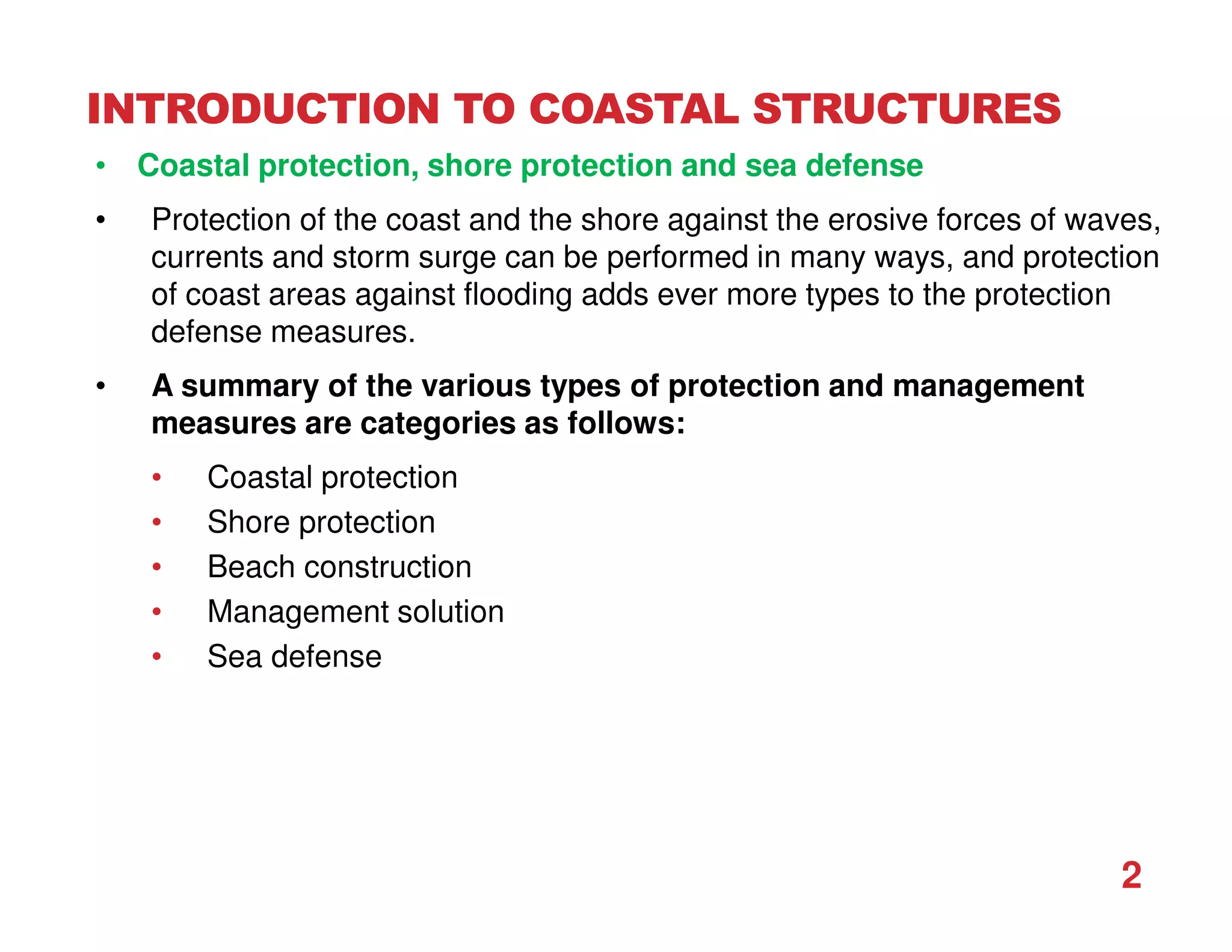 The document provides an introduction to various coastal structures used for coastal protection. It describes sea dikes, sea walls, revetments, emergency protection, bulkheads, groynes, jetties, breakwaters, and detached breakwaters. Each coastal structure is defined and its applicability is discussed. The document categorizes coastal protection structures as coastal protection, shore protection, beach construction, management solutions, and sea defense. It aims to give an overview of different types of structures used to protect coasts from erosion, flooding, and damage from waves and currents.
