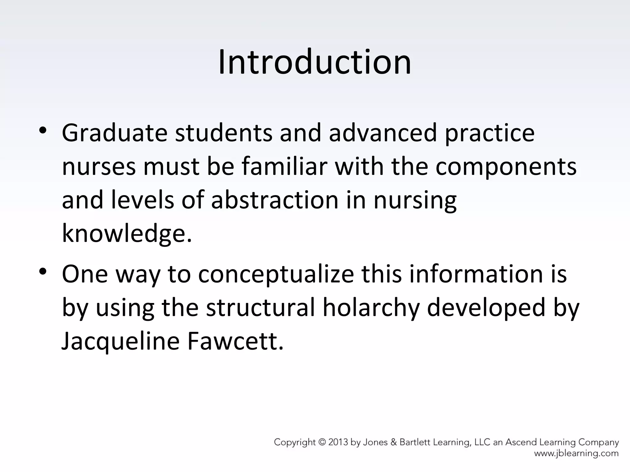 Fawcett's structural holarchy conceptualizes nursing knowledge through five interconnected components: metaparadigm, philosophy, conceptual model, theory, and empirical indicator. Middle-range theories that are strongly linked to conceptual models drive nursing research and changes in practice. The conceptual-theoretical-empirical system translates nursing's conceptual foundations into standards, protocols, and evaluations that guide practice.