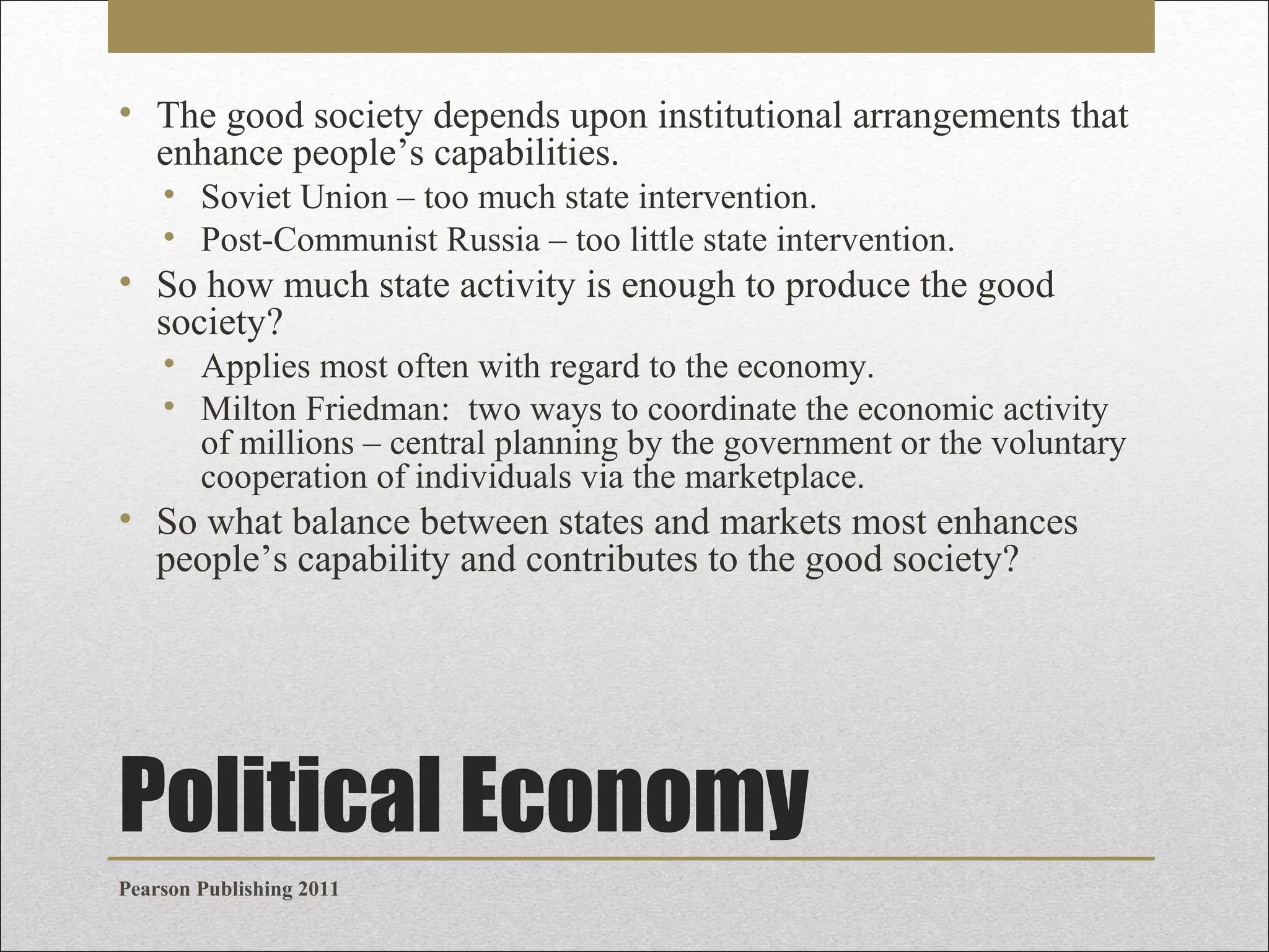 The document discusses different forms of state intervention in market systems and their impact on society. It provides examples of fiscal policy, monetary policy, regulation, and nationalization used by states to influence economic conditions. It also examines the advantages and disadvantages of market systems and debates around balancing state intervention with free markets. Figures and tables are presented analyzing the relationship between different political economies and outcomes like physical well-being, education, and safety. The conclusion discusses finding the right balance between states and markets.