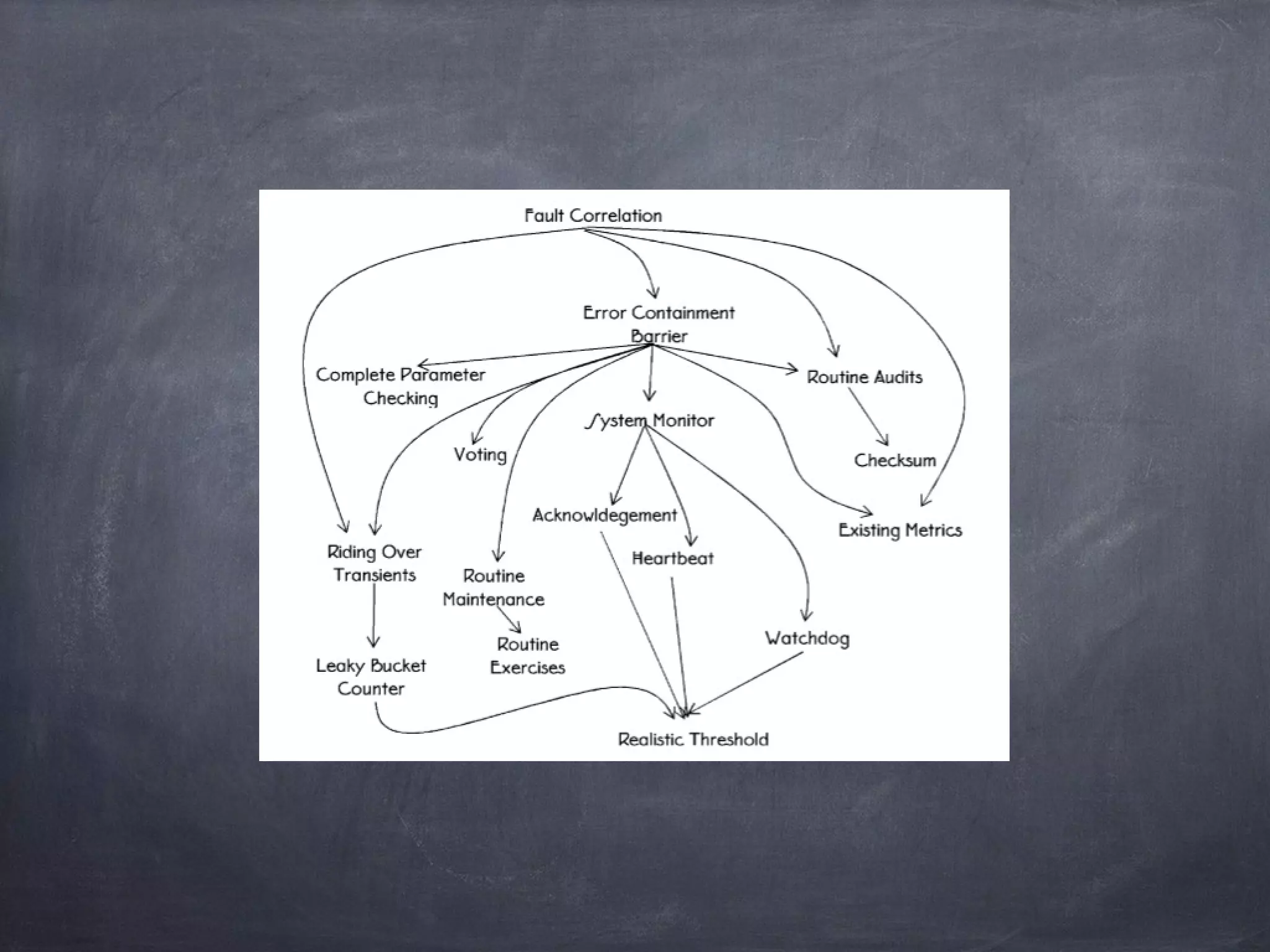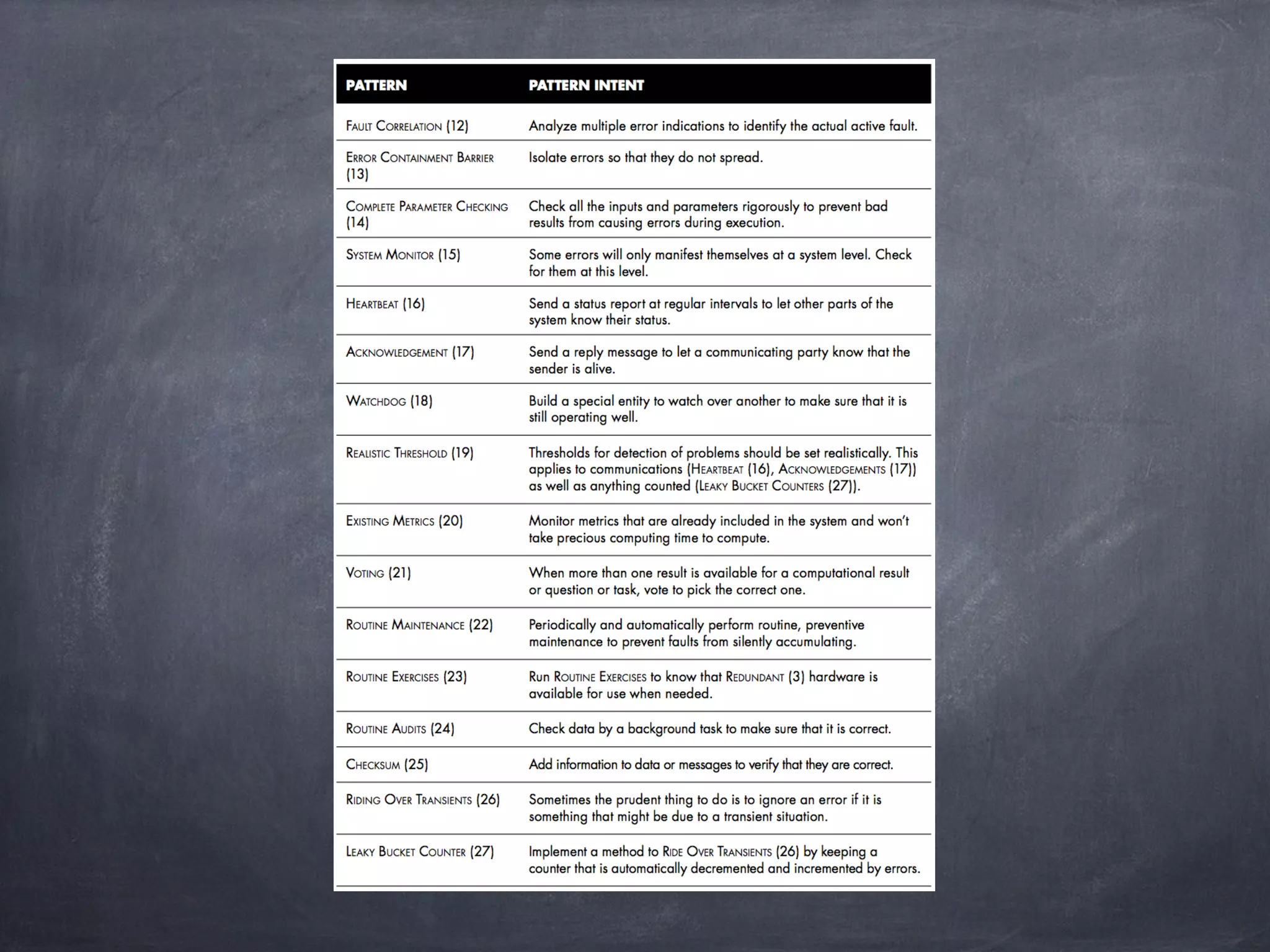 This document discusses patterns for fault detection in software systems. It describes a priori detection using constraints on system states, results and side effects. It also covers comparing redundant results to identify faulty components, and using techniques like Bayesian learning to determine correct system behavior. Finally, it distinguishes between detecting errors, failures, and faults, noting that errors should be detected and corrected before resulting in failures through techniques like fail-silent crash detection and try/catch blocks.