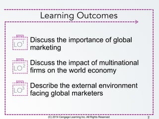The document discusses various aspects of developing a global vision and global marketing strategies. It begins by outlining the importance of global marketing and the impact of multinational firms on the world economy. It then describes the external environment facing global marketers, including factors like culture, economic development, politics, and demographics. The document also identifies different ways for companies to enter the global marketplace, such as exporting, licensing, and direct investment. Finally, it lists the basic elements of the global marketing mix, including product, price, place, promotion, and how these elements need to be adapted for different international markets.