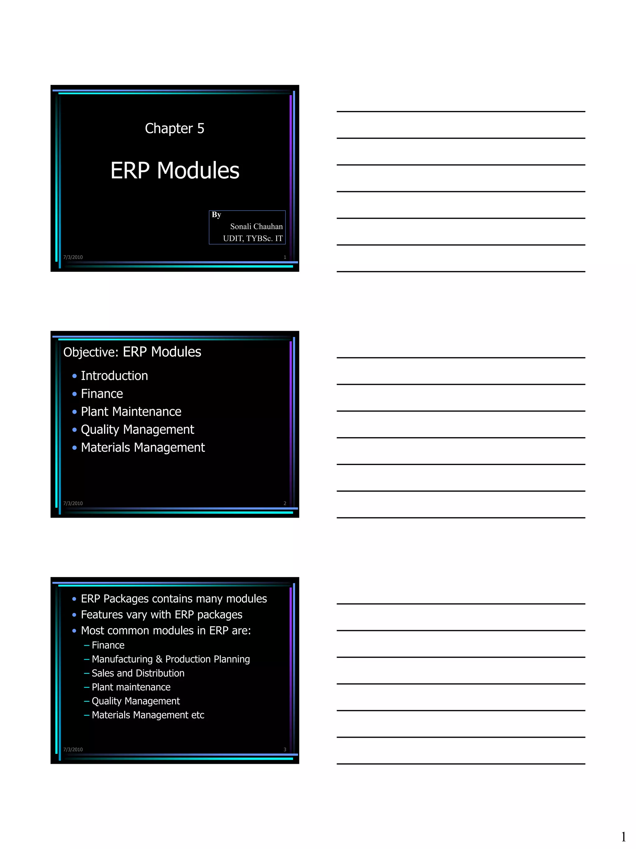The document provides an overview of common ERP modules like finance, plant maintenance, quality management, and materials management. It describes the objectives and key functions of each module. For example, it states that the finance module handles accounting, controlling costs, treasury management, and enterprise reporting. It also provides detailed descriptions of sub-modules and processes within each ERP module.