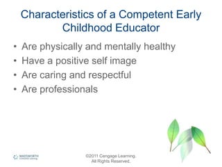 This document discusses the characteristics, knowledge, and preparation needed to be an effective early childhood educator. It outlines that competent educators are healthy, have a positive self-image, are caring and respectful professionals. Educators need knowledge about child development, families, education practices, program implementation, and partnerships. Preparation can include informal opportunities as well as formal education and training, such as mentorships, workshops, continuing education courses, vocational programs, and CDA programs. The document emphasizes that teacher education impacts quality of care and education for infants and toddlers. Educators must observe and record child behaviors using various tools to make educational decisions and plans.
