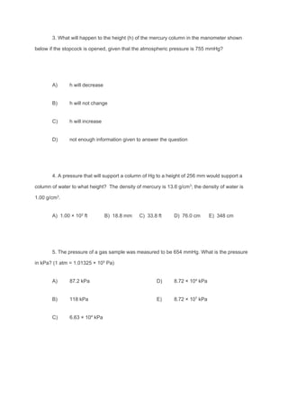 This document contains 22 multiple choice questions about gases and gas laws including Boyle's Law, Charles's Law, Gay-Lussac's Law, Avogadro's Law, and Dalton's Law. The questions cover topics like the relationship between pressure, volume, temperature and amount of gas; partial pressures in gas mixtures; and calculations involving changes in pressure, volume, or temperature of gas samples.