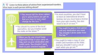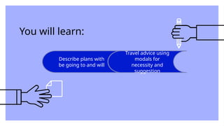 The document covers travel plans, using future tenses 'be going to' and 'will' for expressing decided plans and possibilities. It includes a conversation between two friends discussing vacation plans, along with travel advice and necessary items for traveling. Additionally, it highlights grammar focuses on modals for necessity and suggestion related to travel preparations.