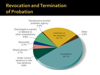The document discusses probation supervision and presentence investigation reports. It covers the purpose and contents of presentence investigation reports, which are used for sentencing and risk management. It also discusses evidence-based supervision techniques for probation officers, specialized supervision programs, and whether probation is effective in reducing criminality. It concludes by examining the different ways probation can end and potential changes to probation in the future.
