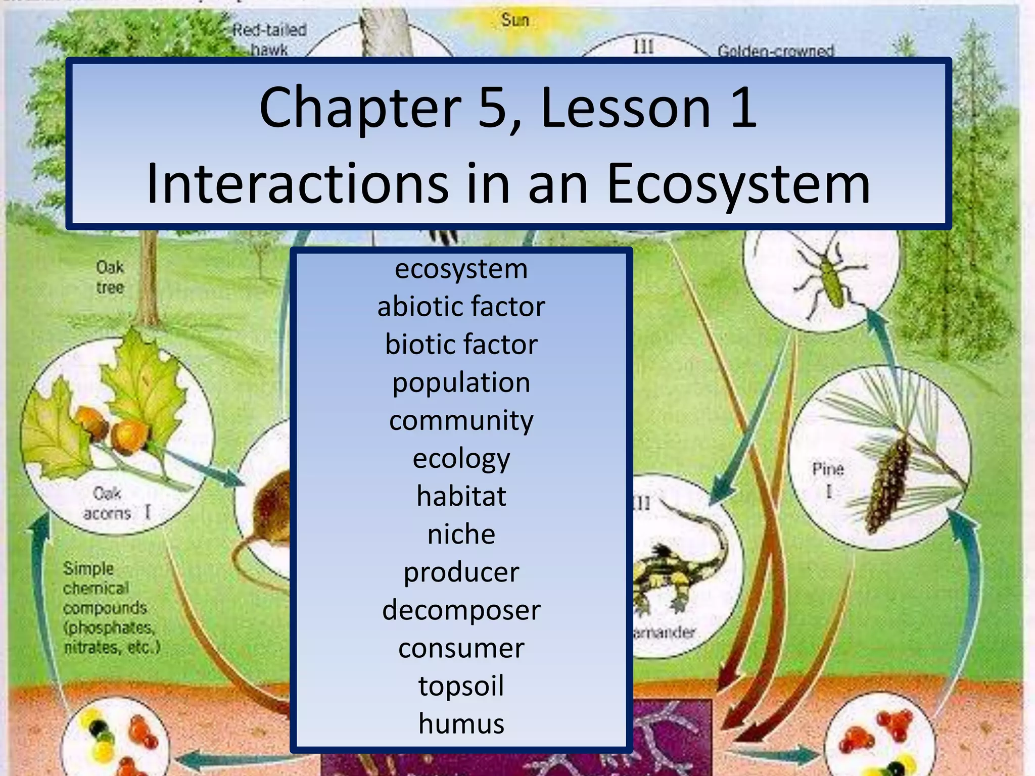 An ecosystem consists of all living and non-living components in an area. It includes abiotic factors like air, water, and soil as well as biotic factors such as plants, animals, and microbes. Organisms within an ecosystem interact as populations of the same species, communities of multiple populations, and through their roles or niches. Producers like plants generate food and oxygen while consumers eat other organisms and decomposers break down dead matter.