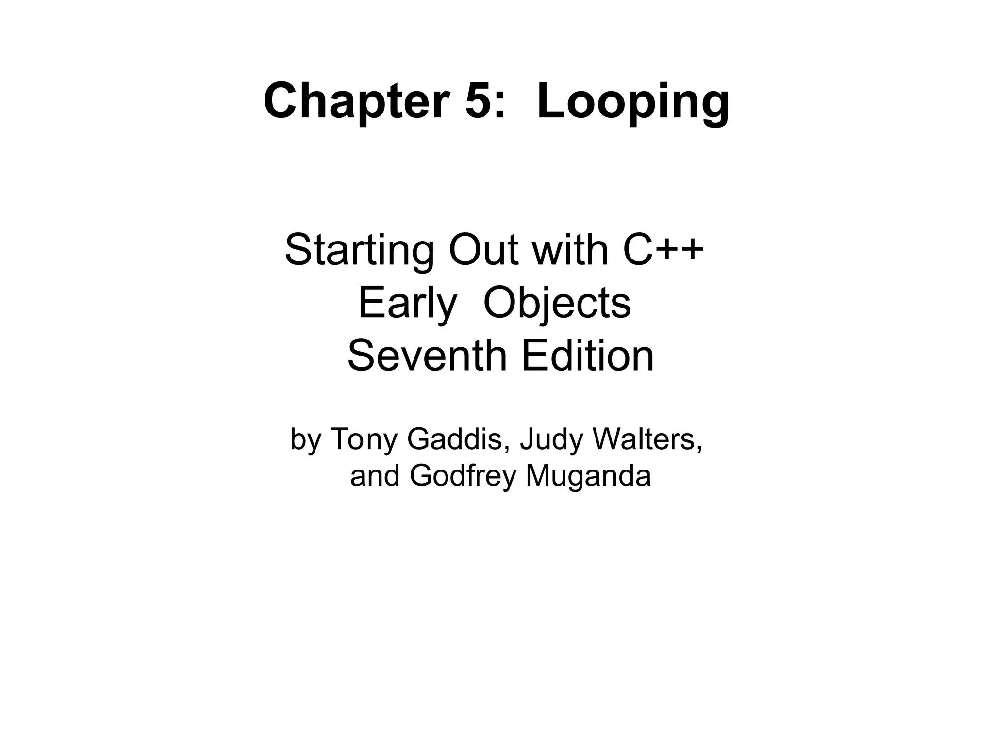 Chapter 5 of 'Starting Out with C++: Early Objects' covers looping, specifically the increment and decrement operators, while loops, and for loops. It explains their syntax, usage, and different scenarios including input validation, counters, and reading from files. Additionally, it discusses nested loops and provides examples for better comprehension.