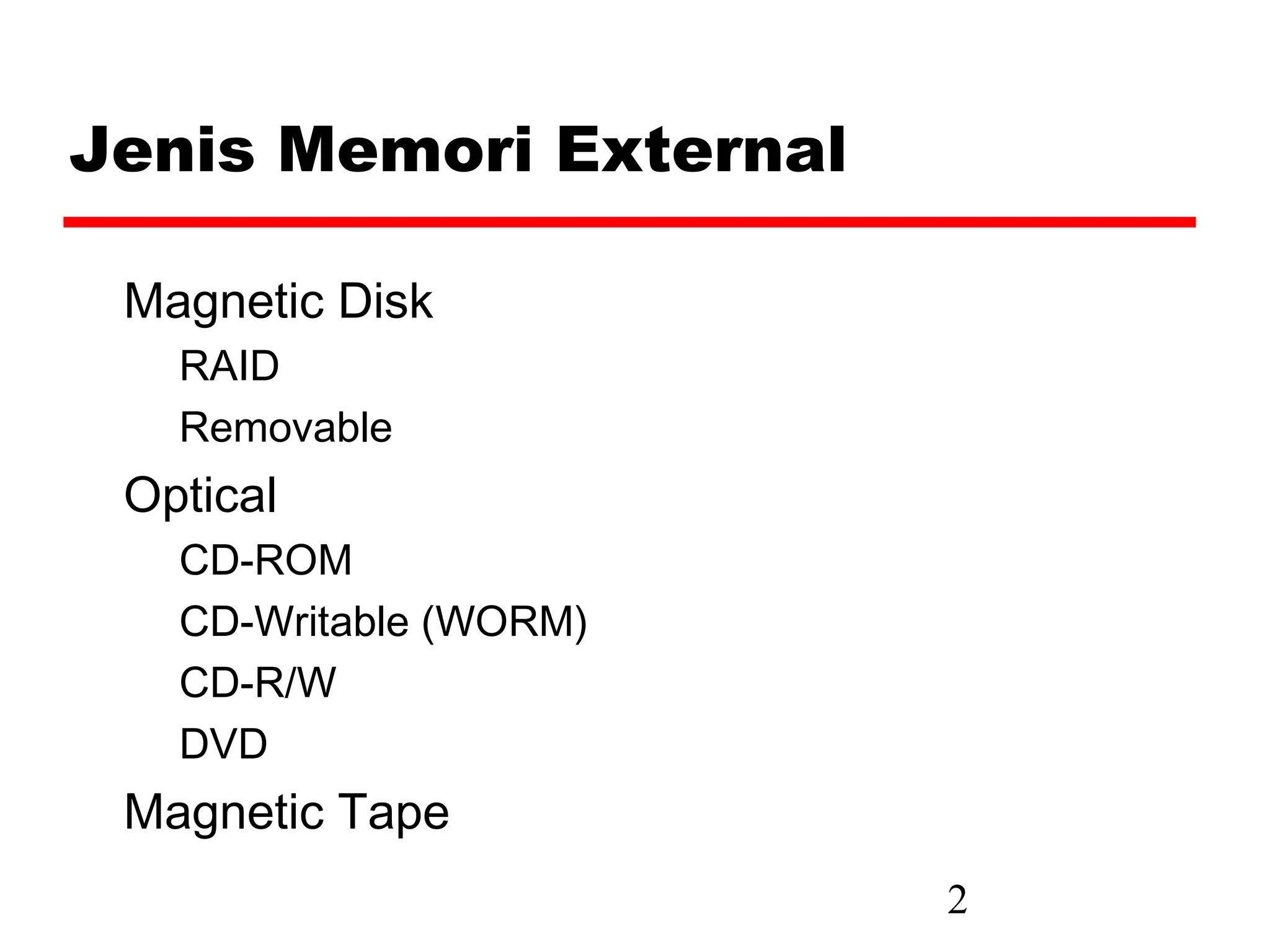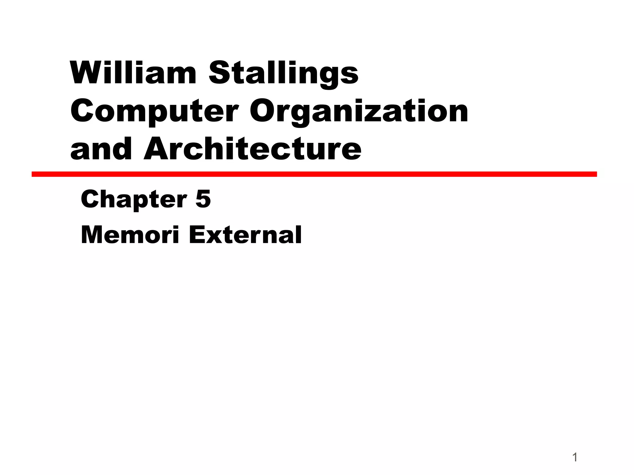 The document discusses various types of external memory including magnetic disk, optical disks, and magnetic tape. It provides details on technologies such as hard disks, floppy disks, CDs, DVDs, and tape drives. RAID configurations are explained which provide data redundancy across multiple disks.