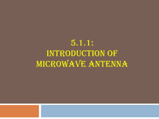 Microwave antennas can take several forms. Horn antennas are popular and can achieve gains up to 25 dB, with directional patterns. Parabolic antennas, like satellite dishes, typically have very high gain between 30-40 dB and low cross polarization. Slot antennas are often used instead of line antennas for greater pattern control and are found in radar and cell antennas. Dipole antennas are half wave resonant conductors that radiate omnidirectionally at right angles to their axis. Their gain is approximately 2 dBi. Dielectric antennas use a traveling surface wave along a dielectric rod to radiate maximally along the rod axis.