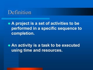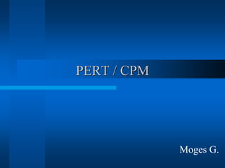 This document provides an overview of the Project Evaluation and Review Technique (PERT) and Critical Path Method (CPM) for project management. It defines key terms like activities, events, and network diagrams. It explains how to construct a network diagram and calculate the critical path, expected activity times, total float, and free float. An example project is used to demonstrate how to perform the calculations to determine the critical activities, expected completion time, and probability of finishing within given timeframes when activity times are estimated as PERT distributions rather than fixed durations.