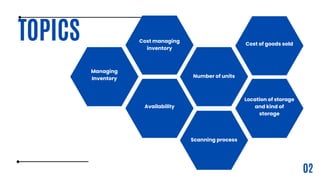 This document discusses the principles of managing inventory, emphasizing the importance of cost, availability, location, and type of storage in inventory management. Key concepts include economic order quantity (EOQ), dead stock, safety stock, and the significance of accurate tracking such as barcoding systems to ensure efficiency. Additionally, it touches upon the implications of costs associated with goods sold, lead time, and the overall lifecycle of inventory.