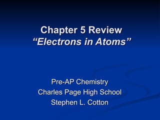 The document is a review of key concepts from Chapter 5 on electrons in atoms. It contains questions about atomic orbitals, electron configuration, the Bohr model of the atom, quantum numbers, electromagnetic radiation, atomic emission spectra, and the quantum mechanical model of the atom.