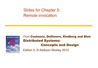 This document discusses remote invocation and distributed systems concepts. It covers request-reply communication protocols, interface definition languages, remote procedure calls, and Java remote method invocation. Key points include how request-reply is synchronous and reliable communication, how interface definition languages allow different language interoperability, and how remote objects use proxies and skeletons to enable remote method calls.