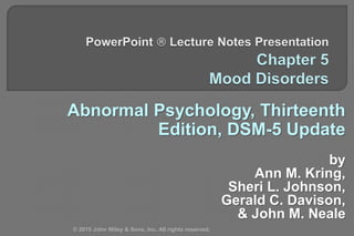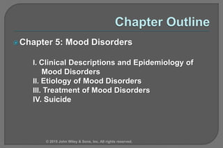 The document provides an overview of mood disorders, including their classifications such as major depressive disorder, persistent depressive disorder, and bipolar disorders. It discusses the clinical descriptions, epidemiology, etiology, treatment options, and the prevalence of these disorders, highlighting the impact of genetics, neurotransmitter levels, and psychosocial factors. Additionally, it covers various therapeutic approaches and the effectiveness of medication and psychotherapy in treating mood disorders.