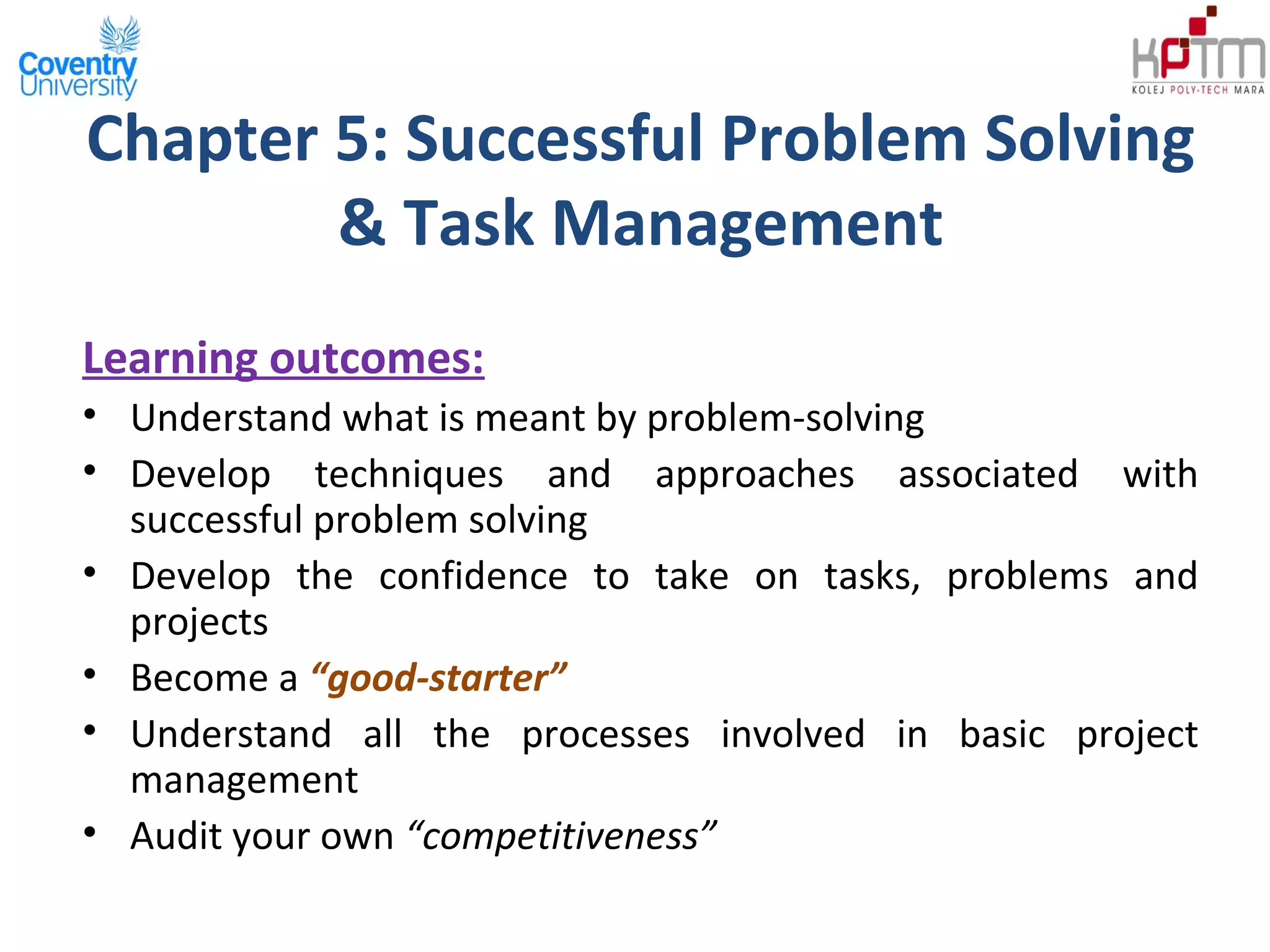 This chapter discusses techniques for successful problem solving and task management. It outlines the basic approaches to problem solving such as talking to others, making lists, finding information, calculating, following rules, trial and error, visualizing and charting. The ROSA-E strategy is presented as a cycle for problem analysis and project management. Key problem solving techniques include setting goals and criteria, prioritizing tasks, setting SMART targets, planning time, starting tasks, becoming a self-starter, sticking with tasks, and completing tasks. Mastering these skills and strategies can help one effectively solve problems and manage projects.