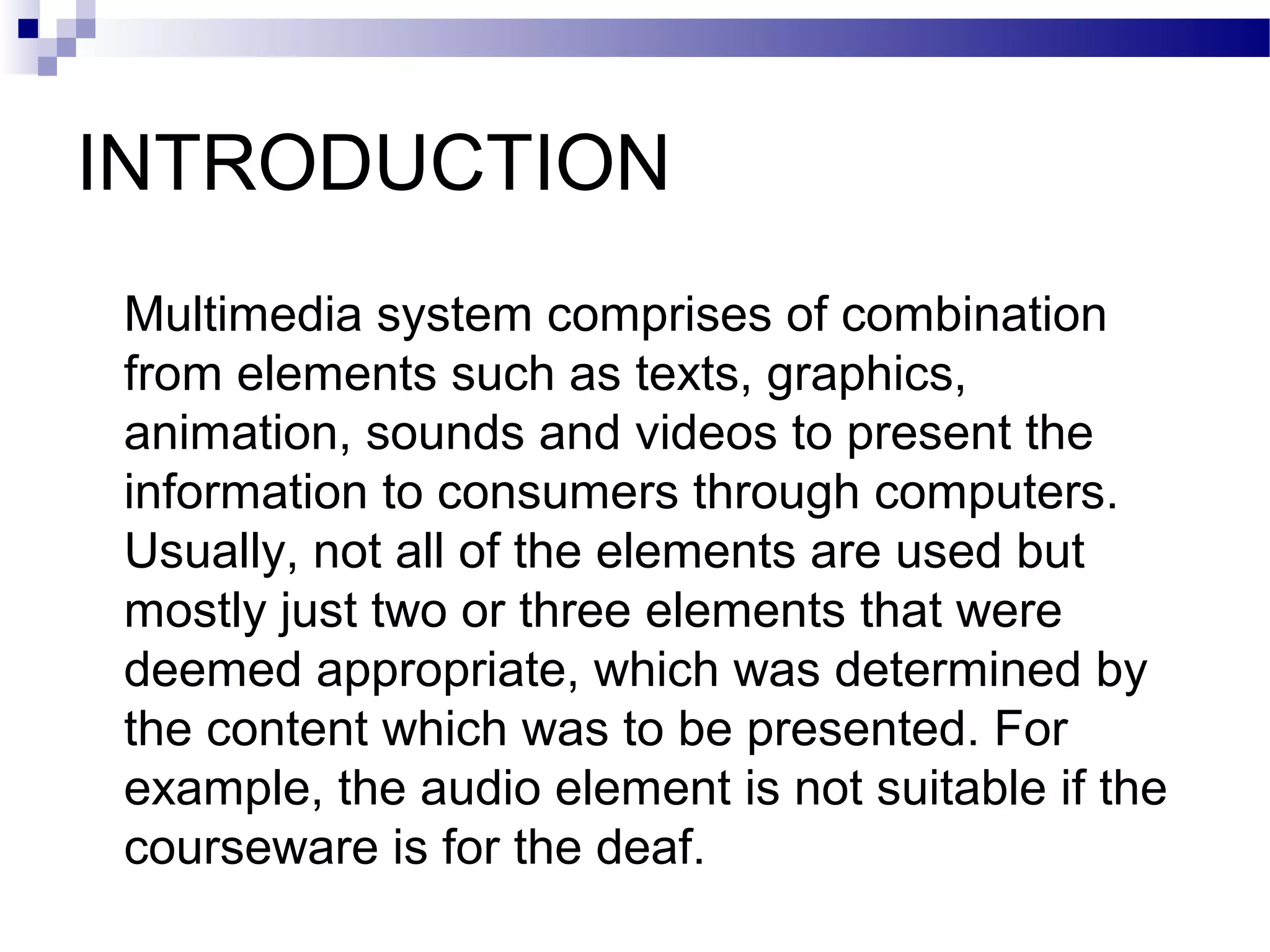 The document discusses multimedia systems and the process of designing systematic teaching. It defines multimedia systems as combining various elements like text, graphics, animation, sound and video to present information. The main elements are described as text, graphics, video, animation, audio and hypermedia. It then explains the ADDIE model of instructional design which consists of the five phases of analysis, design, development, implementation and evaluation. Each phase of the ADDIE model is described in one or two sentences.