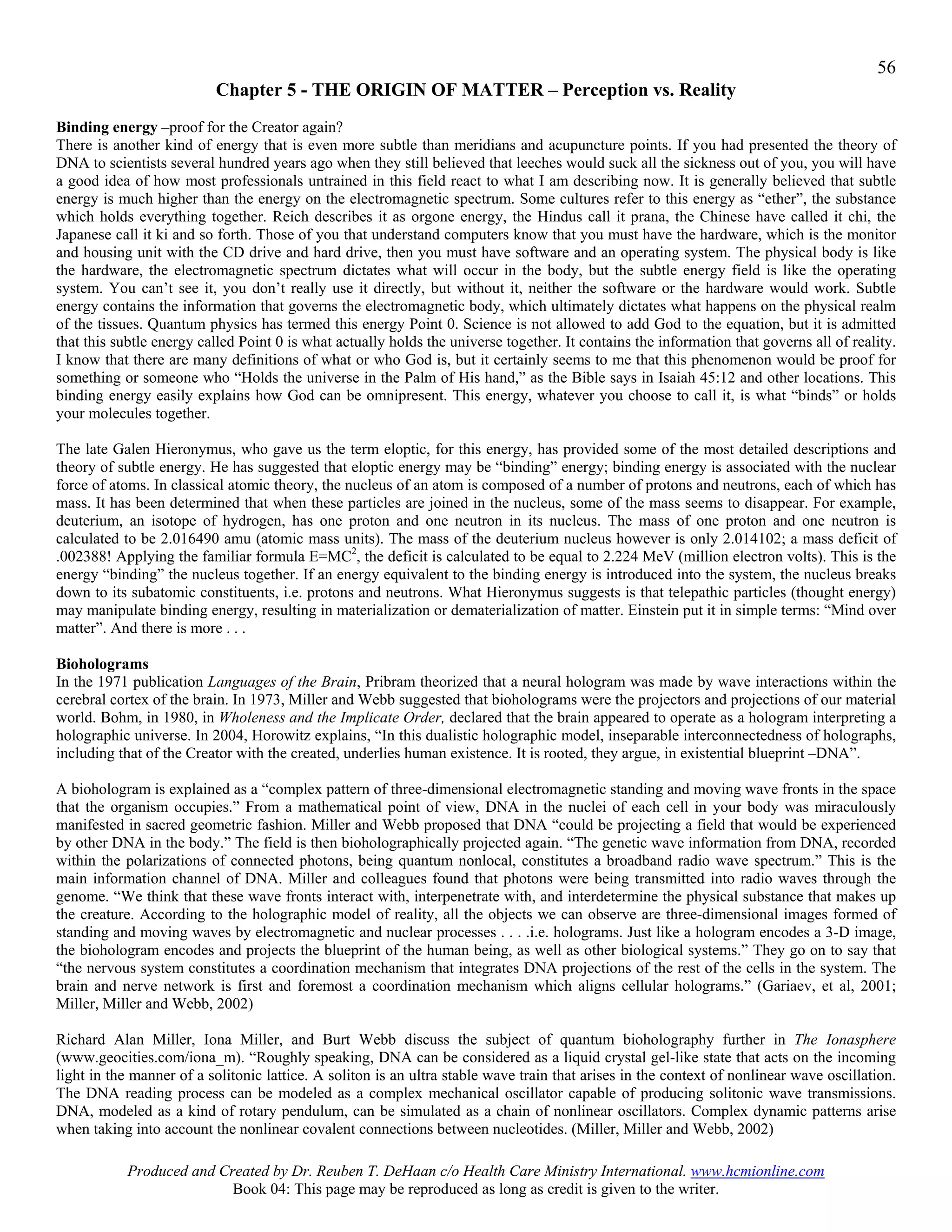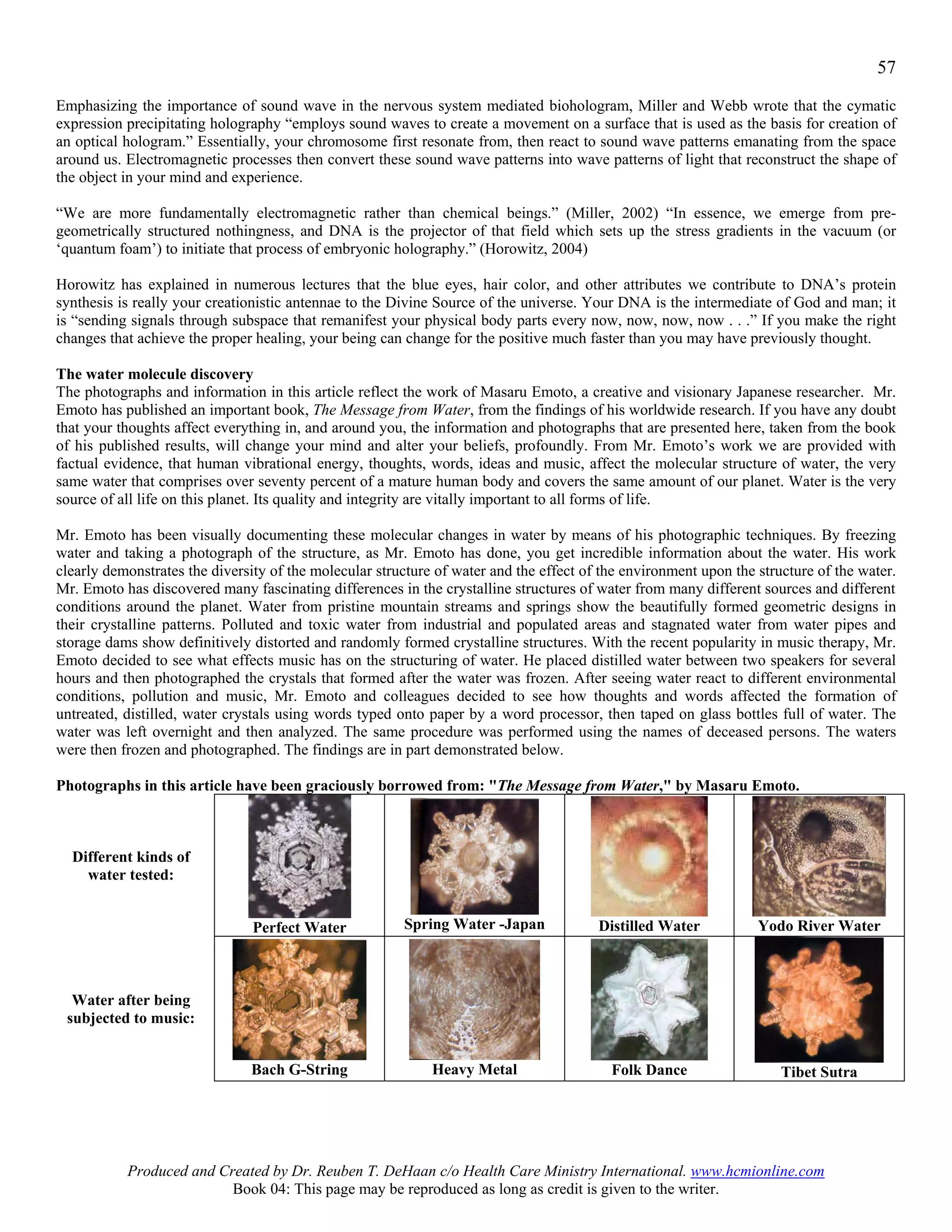 This document discusses theories of subtle energy fields and quantum bioholography. It summarizes research showing that thoughts, words, and music can affect the molecular structure of water. Masaru Emoto's photographs show differences in water crystal formations depending on the words or music they were exposed to. The document also discusses how subtle energy fields act as an "operating system" that governs electromagnetic and physical processes, and may explain phenomena like intuition between twins.