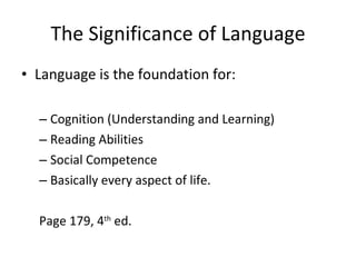 Chapter 5 discusses the significance of speech and language within special education, emphasizing their role in cognition, communication, and social competence. It details the types of speech and language impairments, their identification by speech/language pathologists, and the importance of early intervention and collaborative support in addressing these challenges. Additionally, it covers the historical context of speech therapy and the development of supportive measures and technologies for individuals with speech and language difficulties.
