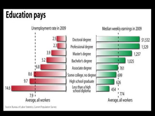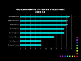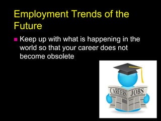 This document discusses trends in careers and education that will impact employment opportunities in the future. It notes that the largest generations currently are Baby Boomers, born between 1946-1964, and Generation X, born between 1965-1977. The newest generation entering the workforce is called Millennials, born between 1977-1995. The document outlines several career fields that are expected to grow substantially in the coming years, such as healthcare, technology, green jobs, and education. It emphasizes the importance of continuing education and developing skills that will remain relevant as technology advances and the nature of work changes. Overall, the key message is that planning for one's career and education can help take advantage of emerging opportunities and combat potential job obsolescence.