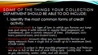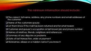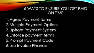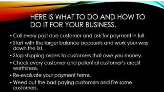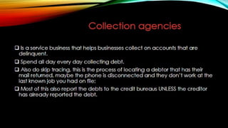 The document outlines effective strategies for debt collection, emphasizing the need for persistence, negotiation skills, and proper communication. It provides insights into when to involve a collection agency and what factors to consider when selecting one, including their qualifications and collection procedures. Furthermore, it discusses the negative impact of late payments on business operations and offers solutions such as establishing clear policies, invoicing promptly, and offering payment incentives.