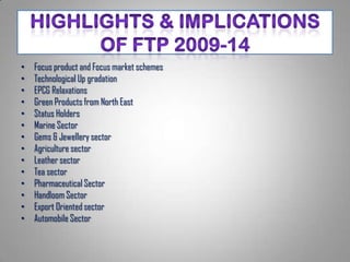 The document outlines India's foreign trade policy, which includes schemes to focus on specific products and markets, technological upgrades, relaxations for Export Promotion Capital Goods, and promoting exports of green products from North Eastern regions. The policy provides privileges like expedited custom clearances and input-output norms fixation to eligible exporters, including manufacturers, service providers, and units located in special economic zones. It also supports exporters through activities like marketing, quality assistance, product research, seminars, input supplies, and training.