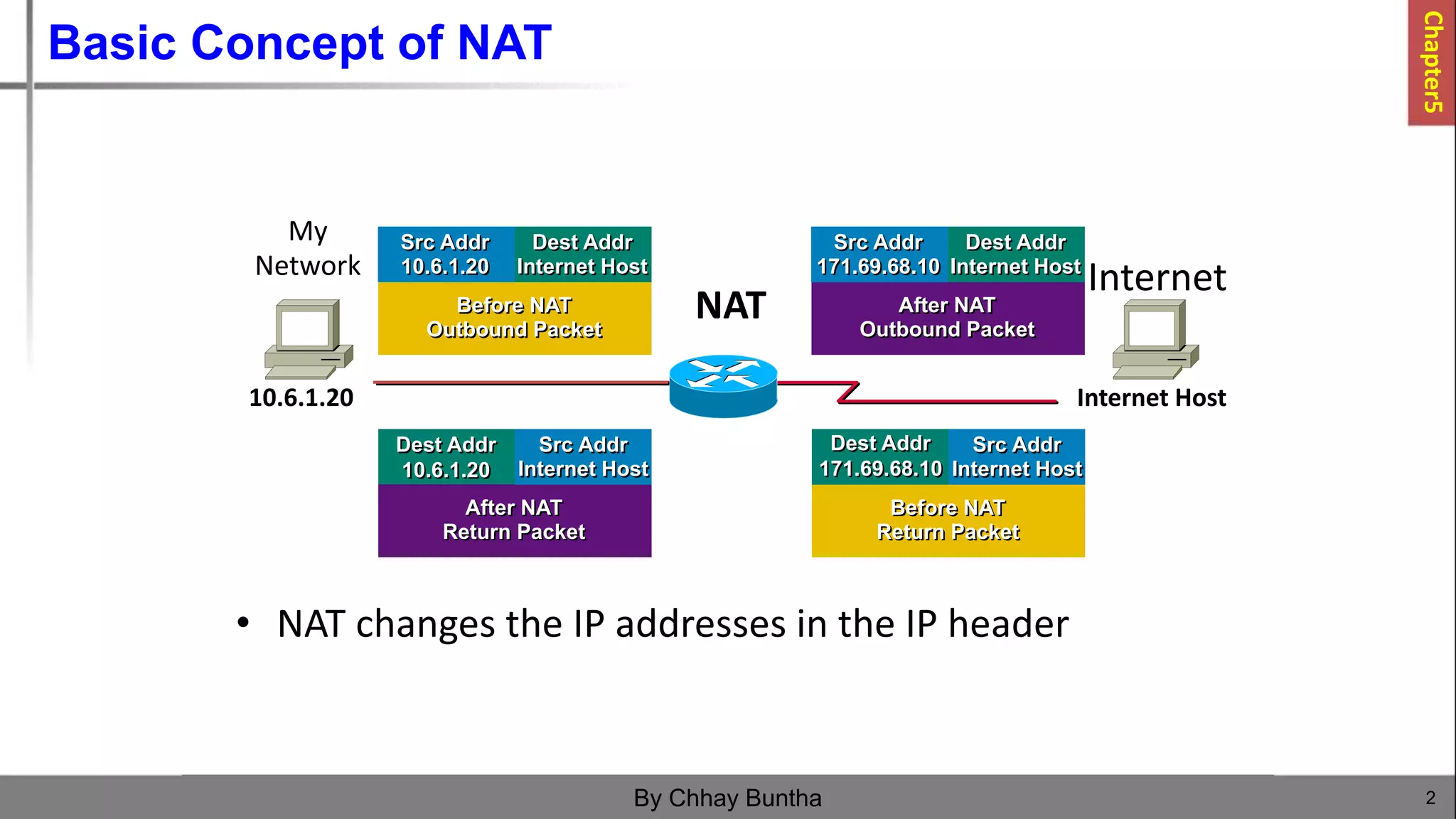 The document discusses network address translation (NAT) and its key concepts. It explains that NAT allows private IP addresses to access the public internet by mapping them to public IP addresses. There are two types of NAT translations - static, where mappings are manually configured, and dynamic, where they are created automatically based on access lists. NAT can perform one-to-one or many-to-one address translations using port address translation (PAT) when there is a shortage of public IP addresses. The document provides examples of how NAT modifies source and destination addresses in packet headers during the translation process.