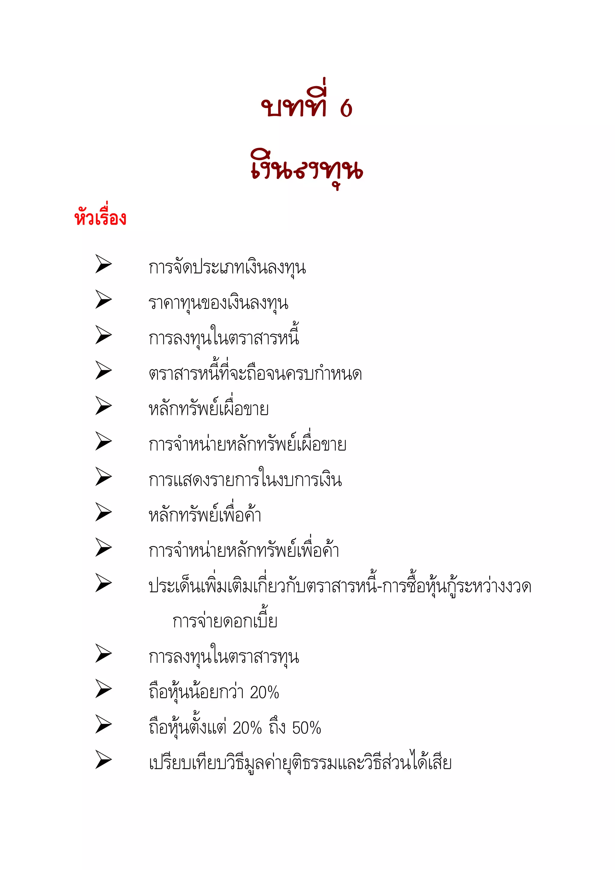 หลักทรัพยเผื่อขาย......................................160,000 คาเผื่อการปรับมูลคาเงินลงทุน - เผื่อขาย ......20,000 กําไรขาดทุนที่ยังไมเกิดขึ้น - สวนของผูถือหุน........ 20,000 ตราสารหนี้ที่จะถือจนครบกําหนด........................ 160,000 การโอนเปลี่ยนหลักทรัพยเผื่อขายเปนตราสารหนี้ที่จะถือจน ครบกําหนด ตัวอยางที่ 6-14 สมมติวาบริษัทนนทรี จํากัด จะโอนหุนกูบริษัทการบิน ไทยจากหลักทรัพยที่มีเผื่อขายไปเปนหลักทรัพยที่จะถือไวจนครบกําหนด หุนกูซื้อมาในวันที่ 31 ธค. 25+8 ในราคาที่ตราไว 200,000 บาท กอนการโอน หลักทรัพยเผื่อขาย ถือจนครบกําหนด ราคาทุน มูลคา ราคาทุน มูลคา ยุติธรรม ยุติธรรม หุนกูบริษัทการบิน 200,000 208,000 ไมมีกลุมหลักทรัพยลงทุน ไทย หลังการโอน หลักทรัพยเผื่อขาย ถือจนครบกําหนด ราคาทุน มูลคา ราคาทุน มูลคา ยุติธรรม ยุติธรรม ไมมีกลุมหลักทรัพยลงทุน หุนกูบริษัทการ 200,000 208,000 บินไทย