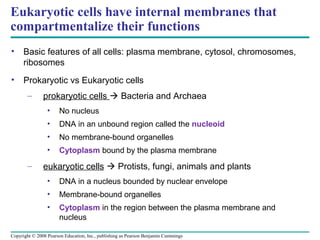 Eukaryotic cells have internal membranes that compartmentalize their functions. Prokaryotic cells lack membrane-bound organelles and have DNA in the nucleoid, while eukaryotic cells have a nucleus bounded by a nuclear envelope that contains DNA, as well as other membrane-bound organelles. The endomembrane system, including the nuclear envelope, ER, Golgi apparatus, lysosomes, vacuoles and plasma membrane, works together to transport materials within the cell.
