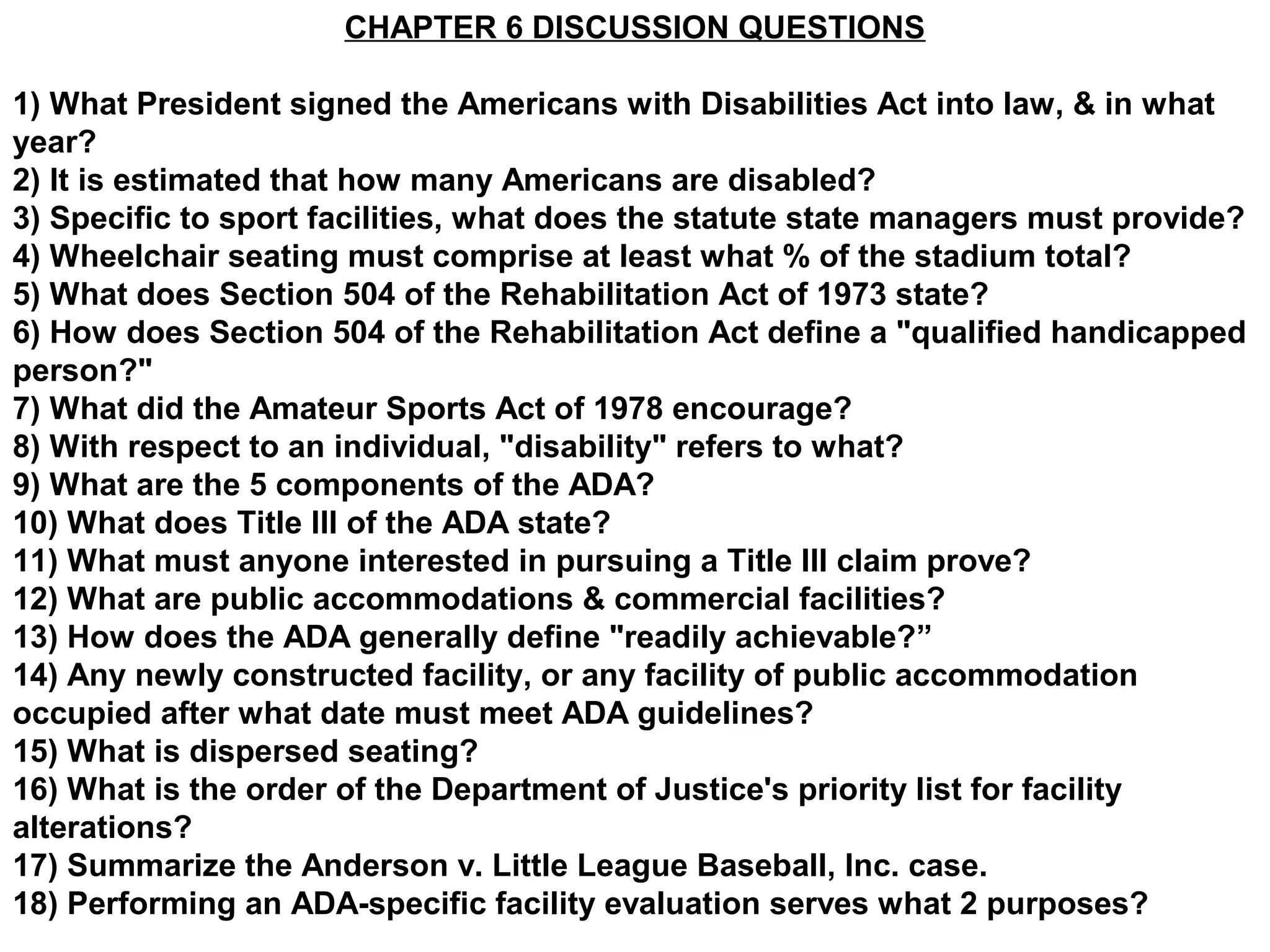 The document discusses the Americans with Disabilities Act (ADA) which was signed into law in 1990 by President George H. W. Bush. It aims to eliminate discrimination against individuals with disabilities. The ADA estimates that around 43 million Americans have a disability. It defines a person with a disability as someone who has a physical or mental impairment that substantially limits a major life activity, has a record of such impairment, or is regarded as having such an impairment. The ADA also requires that public facilities like stadiums provide accommodations for disabled individuals such as wheelchair seating and accessible entrances.