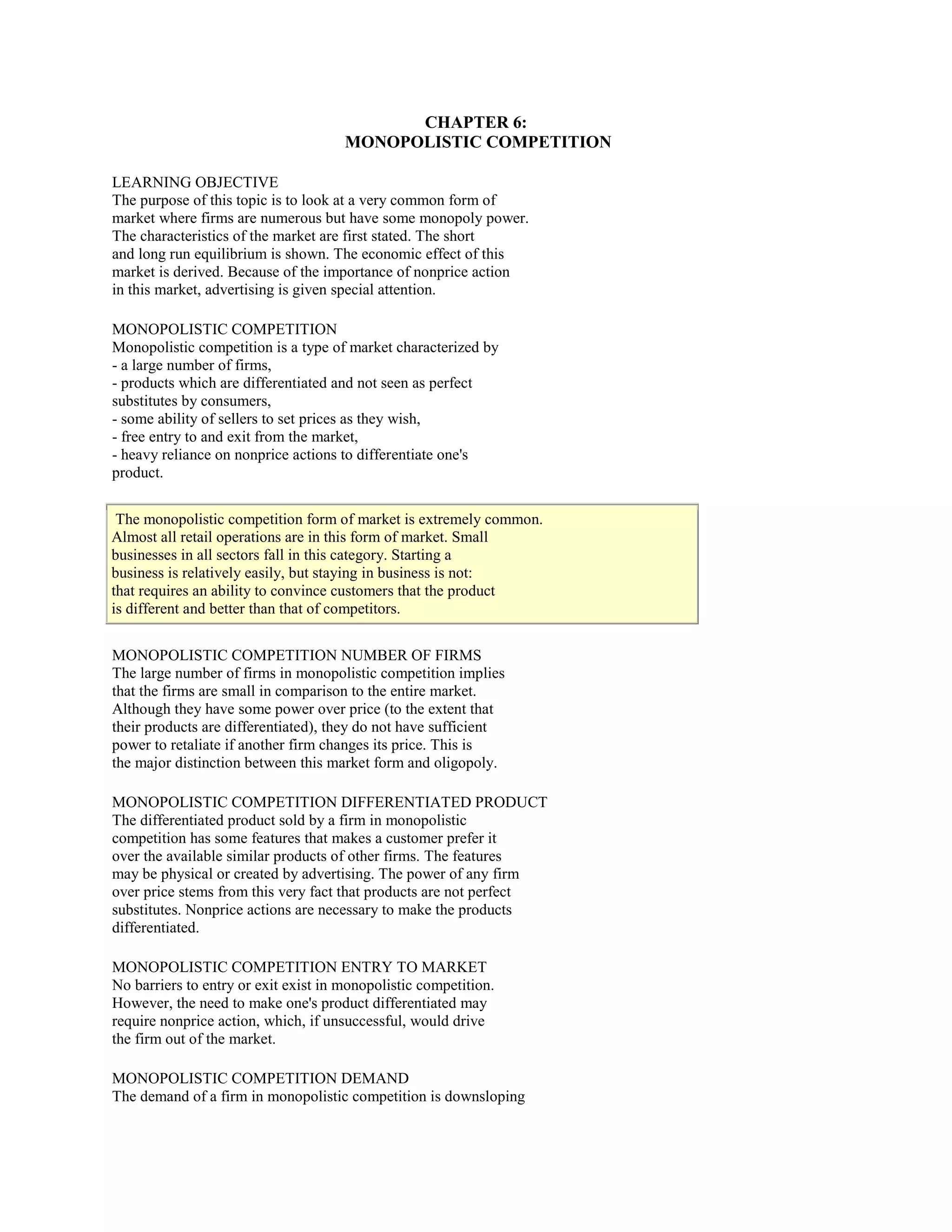 Monopolistic competition is a market structure with many small firms that produce differentiated products. While firms have some control over prices, products are still close substitutes. Firms rely on non-price competition like advertising to differentiate themselves. In the long run, firms will earn zero economic profits as entry and exit causes demand to equal average cost. Monopolistic competition results in some inefficiency but provides greater variety compared to perfect competition.