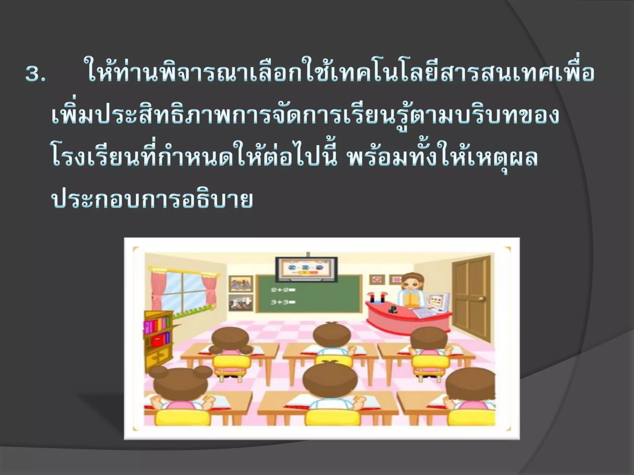 ให้ท่านพิจารณาเลือกใช้เทคโนโลยีสารสนเทศเพื่อเพิ่ม ประสิทธิภาพการจัดการเรียนรู้ ตามบริบทของโรงเรียนที่ กาหนดให้ต่อไปนี้ พร้อมทั้งให้เหตุผลประกอบการอธิบาย