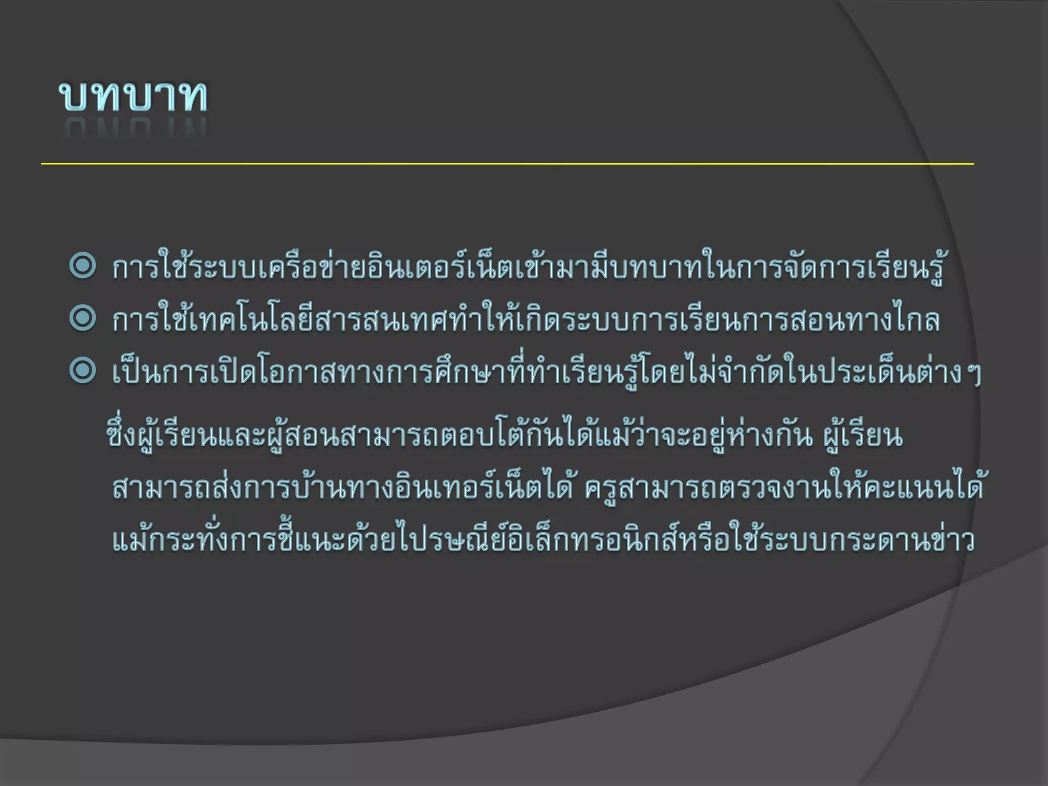 บทบาทและความสาคัญของเทคโนโลยี สารสนเทศกับการพัฒนาการศึกษา การนาเทคโนโลยีสารสนเทศมาใช้ในด้านการศึกษา จะส่งเสริมการเรียนการสอนที่เน้นผู้เรียนเป็น ศูนย์กลาง เช่น