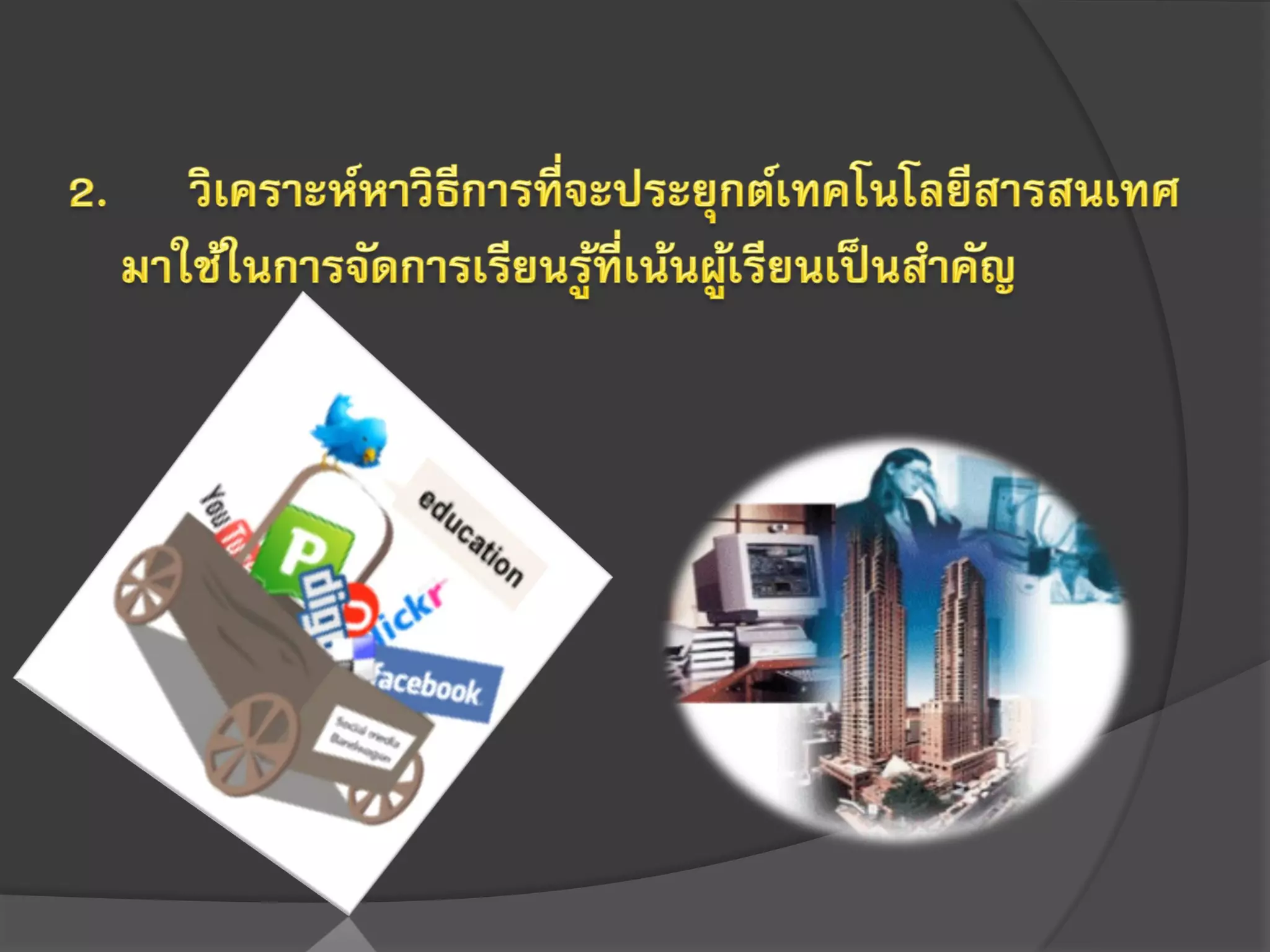 1. วิเคราะห์บทบาทและความสาคัญของเทคโนโลยีสารสนเทศกับ การพัฒนาการศึกษาตามแนวทางปฏิรูปการศึกษา 2. วิเคราะห์หาวิธีการที่จะประยุกต์เทคโนโลยีสารสนเทศมาใช้ใน การจัดการเรียนรู้ที่เน้นผู้เรียนเป็นสาคัญ 3.