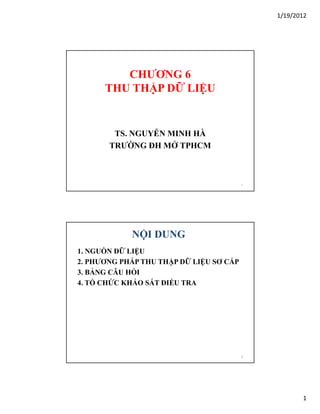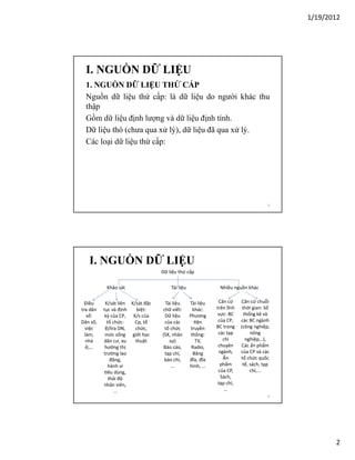 Tài liệu trình bày tổng quan về việc thu thập dữ liệu, bao gồm nguồn dữ liệu thứ cấp và sơ cấp cùng các phương pháp thu thập như quan sát và phỏng vấn. Nó chỉ ra ưu nhược điểm của từng loại dữ liệu và phương pháp, đồng thời đề cập đến cách thiết kế bảng câu hỏi trong nghiên cứu. Cuối cùng, tài liệu nhấn mạnh tầm quan trọng của việc tổ chức khảo sát và đào tạo phỏng vấn viên.