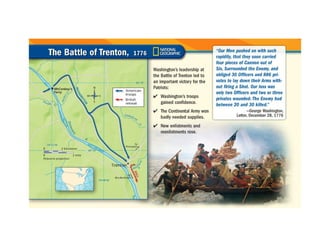 The American Revolutionary War began in 1775 with several key events that led to the colonists declaring independence from Britain. The causes of the war included Britain imposing taxes on the colonies to pay off war debts without colonial representation. Major battles included Bunker Hill, Trenton, Saratoga, and Yorktown. With support from France after the Battle of Saratoga, the Americans were able to turn the tide of the war. The war ended with the Treaty of Paris in 1783, which recognized American independence and established the new borders of the United States.