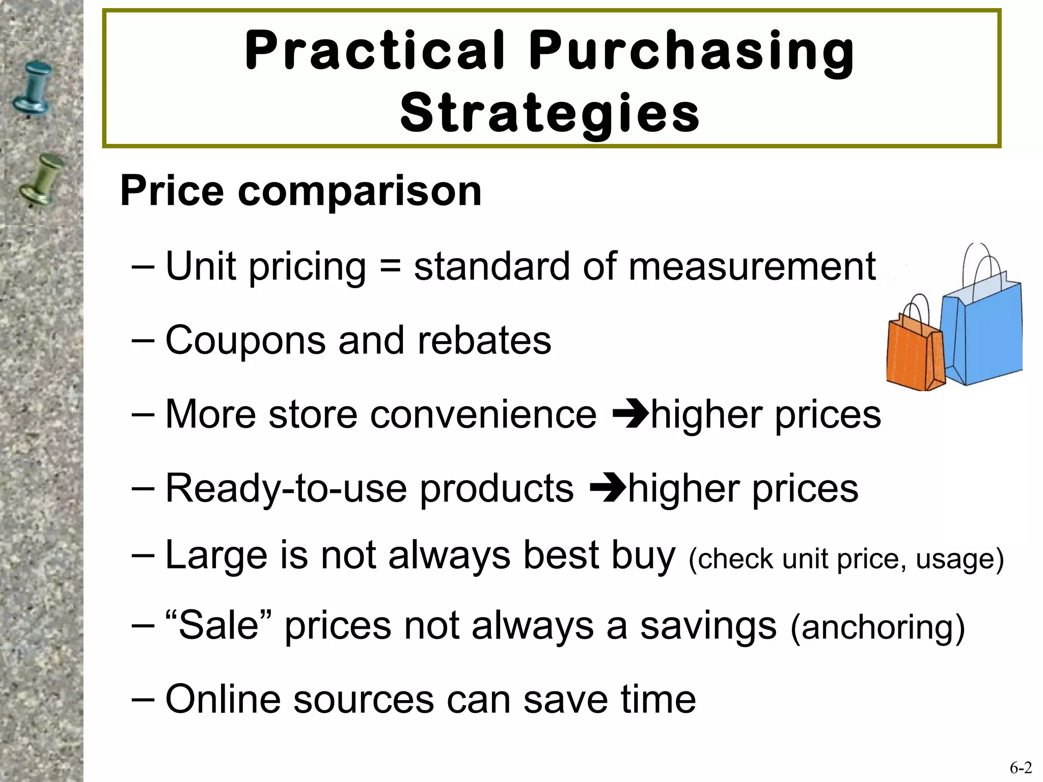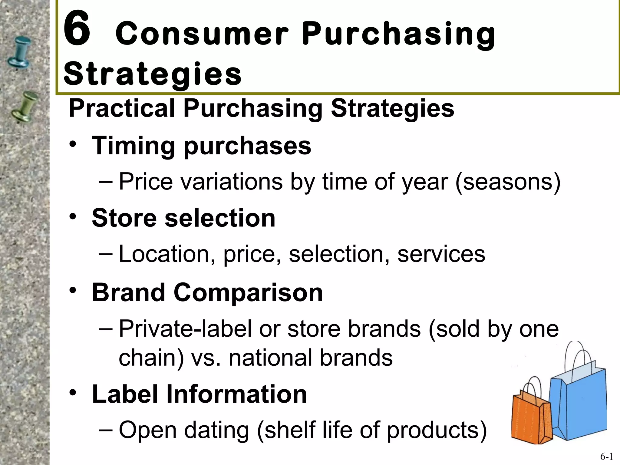 This document provides information on various consumer purchasing strategies and the process of researching and making major consumer purchases. It discusses timing purchases based on seasonal price variations, comparing store brands to national brands, unit pricing, coupons, warranties, used and new car warranties, researching alternatives, negotiating price on new cars, and post-purchase maintenance costs. The document also outlines the major steps in the consumer purchase decision process, including pre-shopping research, evaluating alternatives, determining price and selection, and post-purchase activities. It applies this framework to the example of buying a motor vehicle.