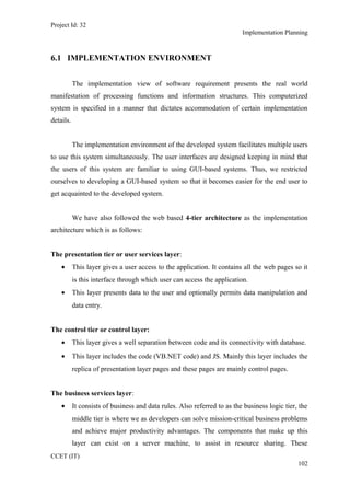 The document discusses implementation planning for Project ID 32. It describes a 4-tier architecture with presentation, control, business, and data tiers. The implementation environment supports multiple simultaneous users through a GUI-based interface. Coding standards are also defined, including naming conventions for variables, functions, and other elements that begin with a prefix to indicate scope or type followed by a meaningful name in mixed case.