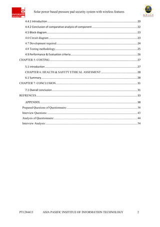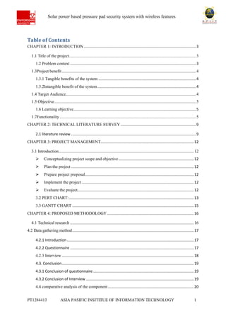 The document describes a proposed solar power based pressure pad security system with wireless features. It includes an introduction that outlines the problem context, benefits, target audience, objectives, functionality, and technical specifications of the system. The introduction is followed by sections on technical literature review, project management, proposed methodology, costing, health and safety assessment, and conclusion. The system aims to provide home and office security using solar power, pressure pad sensors, password/magnetic card door locks, LED displays, and wireless communication. It seeks to address theft issues in an economical and environmentally friendly way.