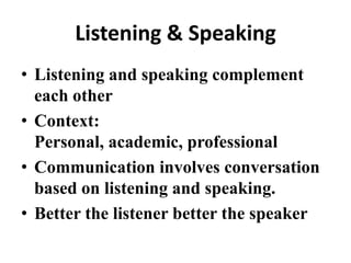 This document discusses effective speaking and listening. It covers various modes and types of listening like active listening, empathetic listening, and barriers to listening. It also discusses types of conversations, paralinguistic features that affect speaking, confidence and clarity in speaking, types of speaking like persuasive speaking, and public speaking. The key aspects of persuasive speaking discussed are credibility, evidence, emotional appeal, and reasoning. Tips are provided for effective conversation, telephone etiquette, writing dialogues, and overcoming barriers to speaking.
