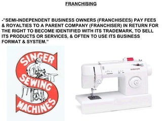 Franchising involves semi-independent franchisees paying fees and royalties to a franchiser in exchange for using the franchiser's trademark, selling its products or services, and often using its business format and system. There are three main types of franchising: trade name franchising which allows use of the franchiser's name without exclusive product distribution; product distribution franchising which licenses franchisees to sell franchiser products under its brand name; and pure franchising which sells a complete business format and system. Some advantages of buying a franchise include management training and support, brand name appeal, and national advertising programs, while drawbacks include franchise fees and royalties, market saturation, and less business freedom.