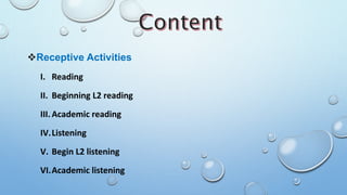 This document discusses receptive language activities, which are reading and listening. It explains that comprehending reading and listening involves both bottom-up processing (using knowledge of language systems like vocabulary and grammar) and top-down processing (using background knowledge of content, context, and culture). It provides details on what each type of processing involves. The document then discusses reading specifically, noting its importance for language learning and academic competence, and outlining six component abilities involved in fluent academic reading.