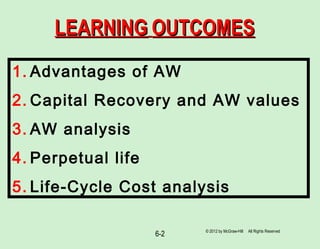 Annual worth (AW) analysis allows engineers to evaluate project alternatives that have different lives by converting all cash flows to equivalent uniform annual amounts at a discount rate. The key advantages of AW analysis are that it only requires calculating values for one life cycle and all cash flows for subsequent cycles will be the same. Engineers can use AW analysis to evaluate both finite-lived and perpetual project alternatives. Life-cycle cost analysis takes a broader perspective by considering all costs incurred over a project's full lifespan from concept to disposal.