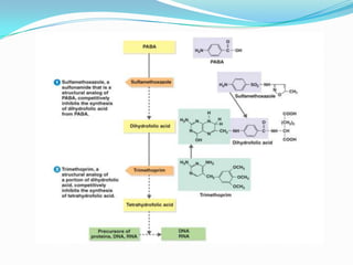 This document discusses antimicrobial drugs, including antibiotics. It defines antibiotics as substances produced by microorganisms that inhibit other microbes. It lists several antibiotic-producing microbes such as Bacillus, Penicillium, Streptomyces, and Micromonospora. The document also discusses the mechanisms of action of antimicrobials including inhibition of cell wall synthesis, protein synthesis, and nucleic acid synthesis. It provides examples of antimicrobials that act through these mechanisms like penicillin, tetracyclines, and rifampin. Finally, it notes some safety concerns with antimicrobial use like toxicity, interactions, resistance, and effects on normal flora.