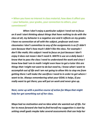 When a student lacks interest in a class, it negatively impacts their behavior, grades, relationships, and commitment. The student finds it difficult to focus in class and thinks about unrelated topics. Their behavior becomes negative, which is reflected in poor grades. They feel no connection to the subject matter, professor, or classmates. The student does not commit to assignments as if they do not care about the class. For example, the student dislikes math but recognizes it is an important subject used daily. To pass, the student needs to focus on understanding the material and may need a tutor. The student knows they want to accomplish goals in life and will make sacrifices, like putting in work to pass uninteresting classes, to achieve their goals.