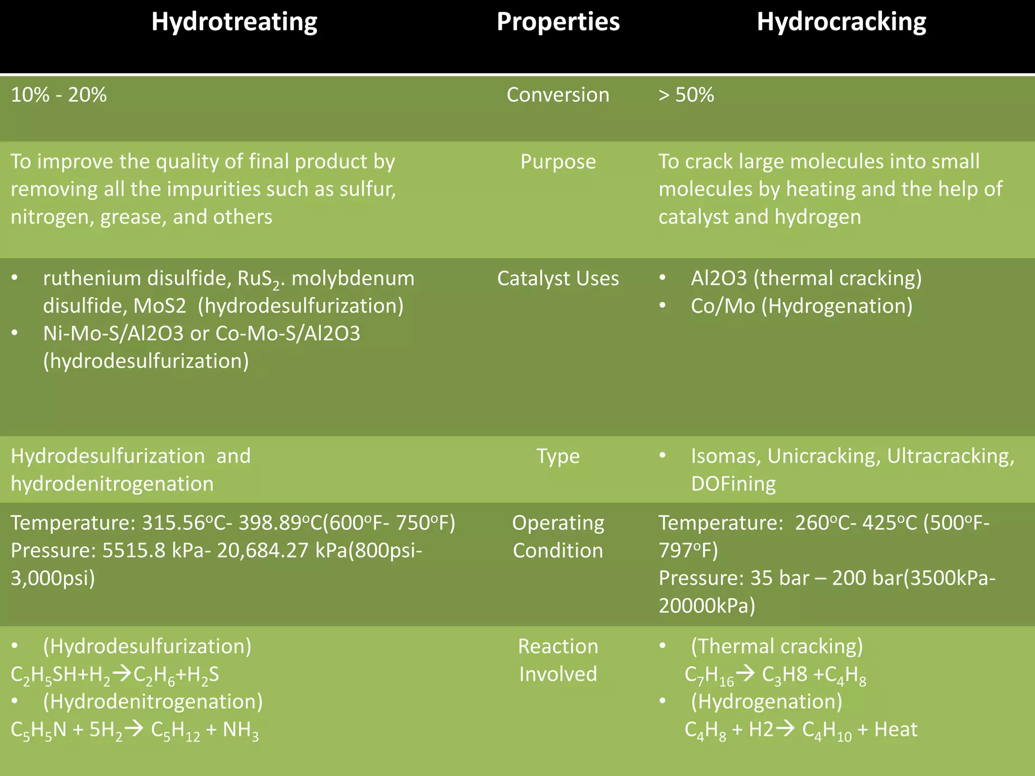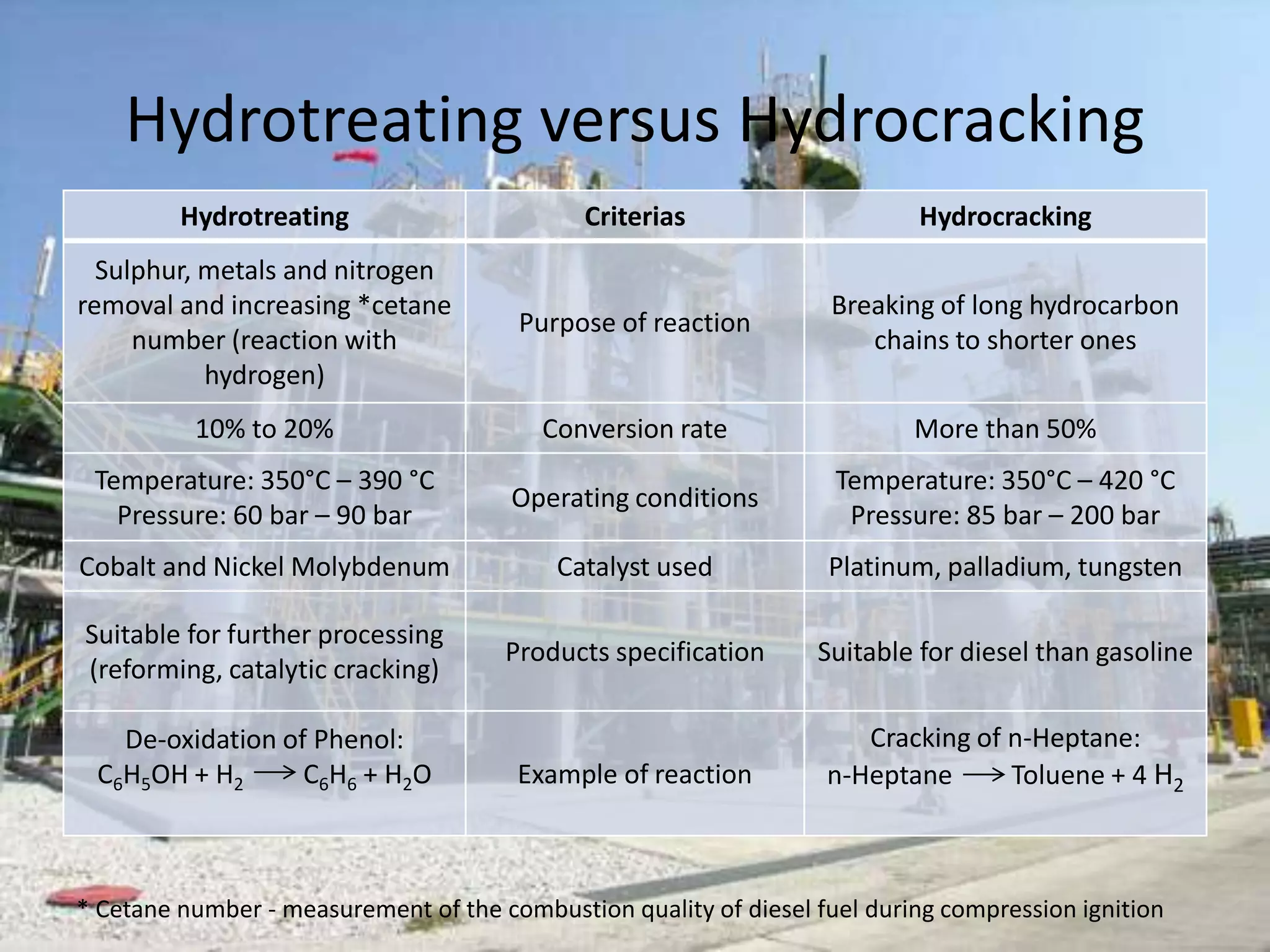 Hydrotreating and hydrocracking are refinery processes that use hydrogen and catalysts. Hydrotreating primarily removes sulfur, nitrogen, and other impurities from petroleum feeds using catalysts like nickel and molybdenum. Its purpose is to improve final product quality. Hydrocracking breaks longer hydrocarbon chains into shorter molecules using platinum or palladium catalysts. It has a higher conversion rate of over 50% compared to 10-20% for hydrotreating. Both processes operate at high temperatures and pressures but hydrocracking conditions are more severe.