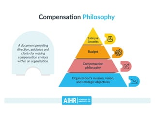 The document discusses compensation and benefits in the public and private sectors. It covers total compensation packages, which include pay and benefits. It describes different types of compensation systems such as point-factor job evaluation, ranking, and broadbanding used to determine pay. Performance-based pay systems that differ from traditional seniority-based systems are also discussed. The key elements of compensation systems including equity, job evaluation methods, salary surveys, and incentive pay plans are summarized.