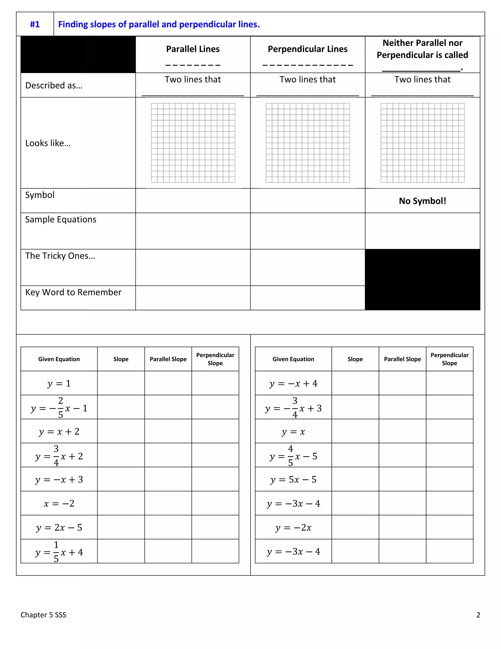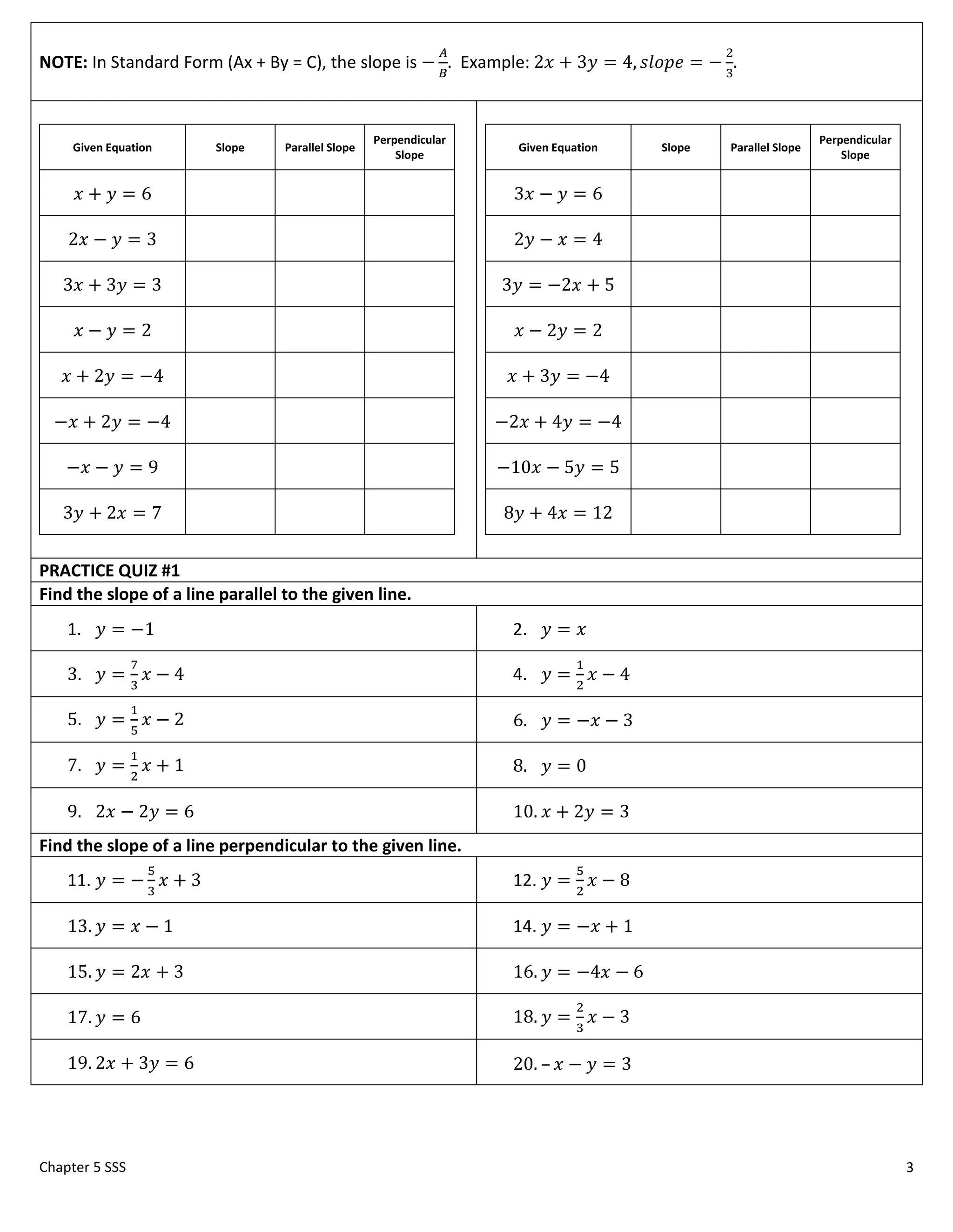 The document discusses parallel and perpendicular lines. Parallel lines have equal slopes and are never perpendicular. Perpendicular lines have slopes that are negative reciprocals of each other. Neither parallel nor perpendicular lines have no relationship between their slopes and are simply not parallel or perpendicular. The document provides examples of finding the slopes of lines parallel and perpendicular to given lines. It includes a practice quiz with problems finding slopes of parallel and perpendicular lines.