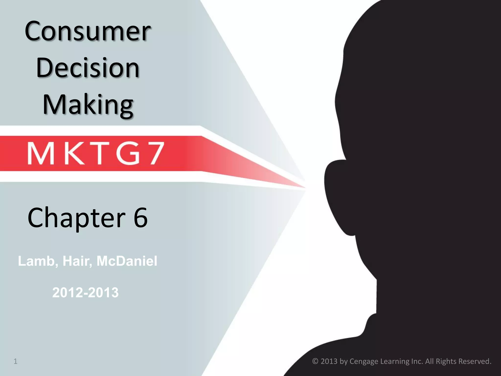 This document provides an overview of consumer decision making by outlining key concepts across 8 chapters. It examines why marketing managers should understand consumer behavior and analyzes the 5 stages of the consumer decision making process: need recognition, information search, evaluation of alternatives, purchase, and post-purchase evaluation. It also identifies the types of consumer buying decisions based on involvement and discusses cultural, social, psychological, and individual factors that influence purchasing.